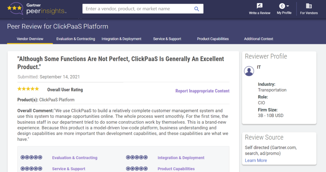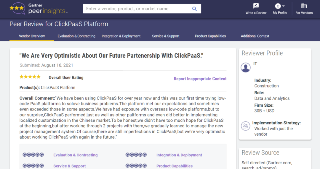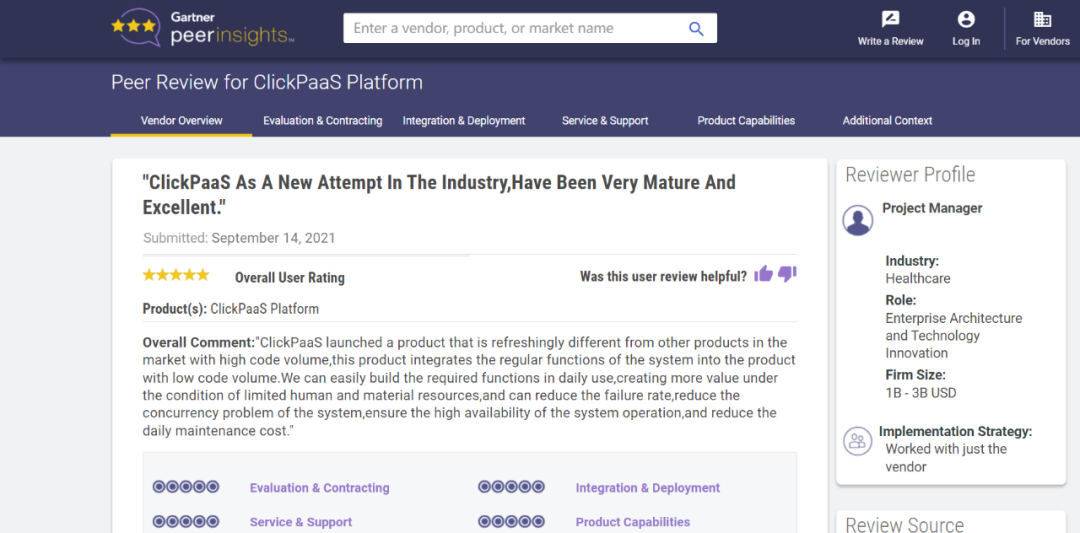 Tips:::::【Peer Insights】——用户对企业IT产品和服务发布真实评价的平台。。。。目前已有355个市场,,,,,,,,,,,,255,000条经过验证的评价。。。。。。。。。每一条评价Gartner会针对参评企业营收规模及参评人员信息做验证、、、、、、、、评价内容做多维核实。。。。。。。