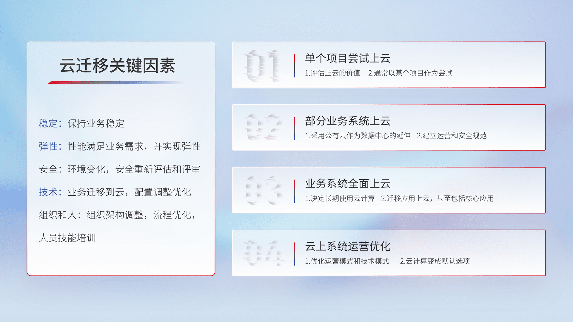 结合实际业务,,,,从规划设计、、云平台选型、、云原生改造、、、、数据迁移、、集成交付,,迁移全过程为客户识别最佳上云路径,,,,做好风险识别管理,,,设计网络架构、、、身份权限、、安全审计合规、、、、操作审计、、日志审计、、监控告警策略、、多站点容灾设计等,,对云上基础设施进行整体规划,,提升IT治理水平,,,,以满足弹性、、高可用、、、、高性能的需求。。。。