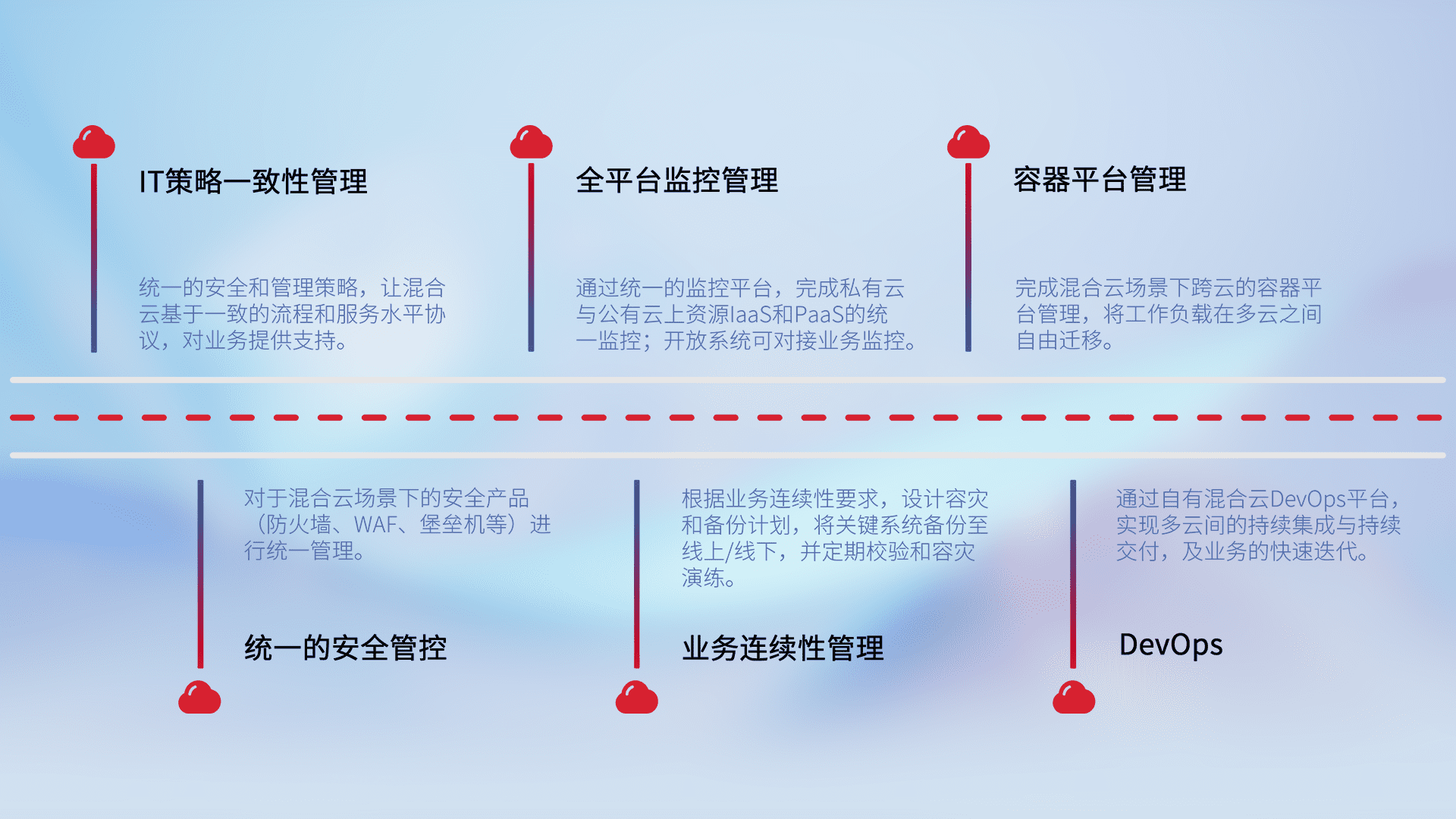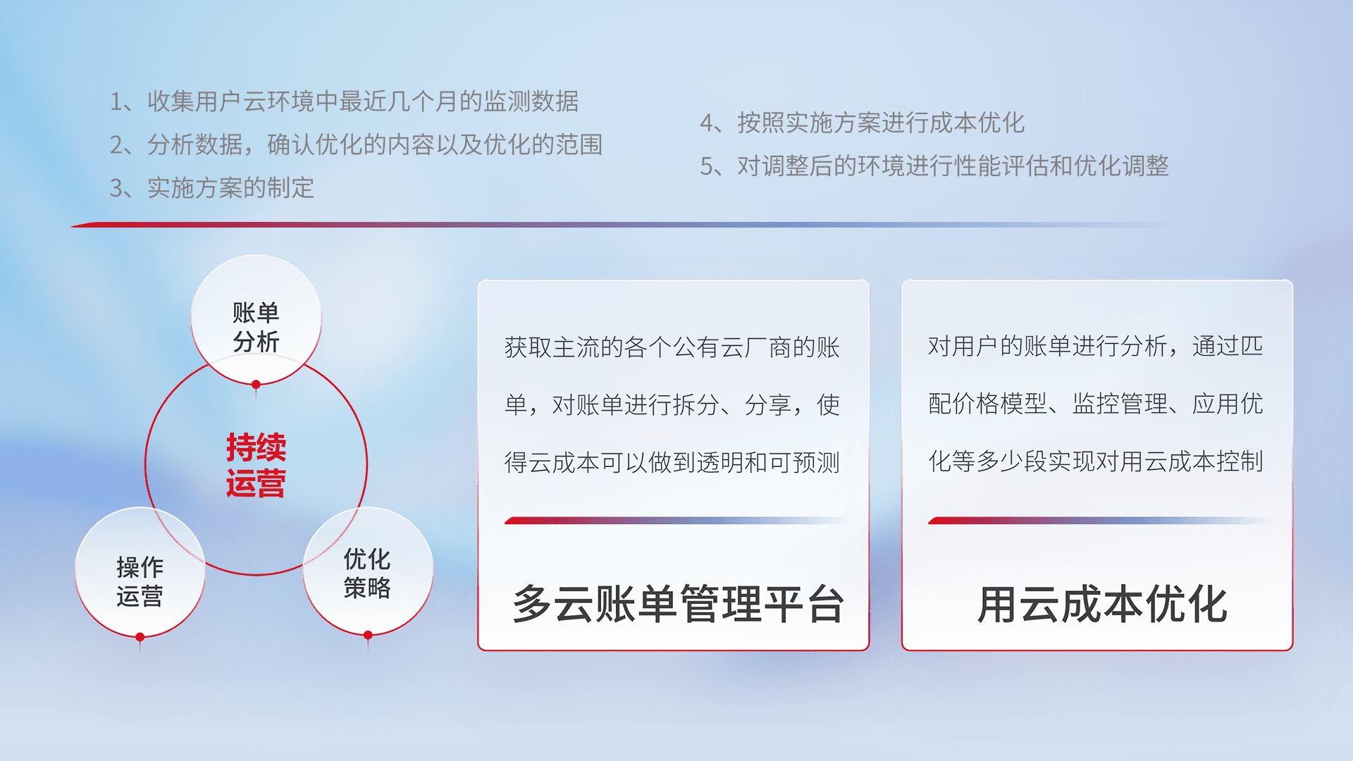 通过多云纳管,,,以统一的资源数据模型把客户的云资源进行抽象和封装,,,进而实现对多云资源的统一操作,,,保障云资源管理的可靠性、、、稳定性与可用性。。。。量身定制化运维内容,,,,配置、、开发运维、、、、补丁管理、、、备份、、、、监控、、、认证和访问管理、、、审计和日常巡检等,,,保障在用云过程中的可靠度,,,稳定度以及高可用率。。。